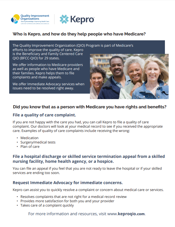The Kepro Beneficiary and Family Centered Care Quality Improvement Organization (BFCC-QIO) handles all Medicare beneficiary complaints, quality of care reviews, medical necessity reviews, and discharge appeals from hospitals, skilled nursing facilities, home health and hospice providers, and rehabilitation facilities.